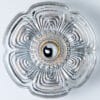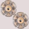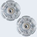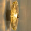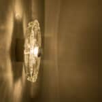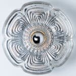 This modernist elegant design is focused on the textured flower shaped thick glass glass, with off white metal base. These wall lights would complement a range of decor schemes.