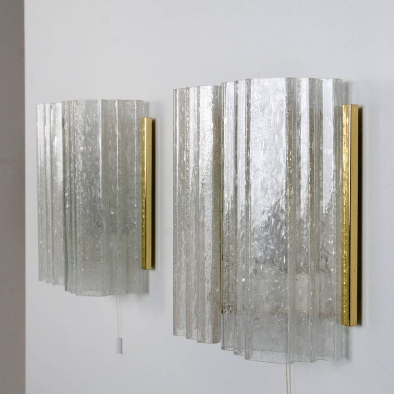 This wall sconces are designed by Doria. Each wall fixture is made from white pained metal with brass details and it features two thick hand blown glass shades. The high quality crystal shades beautifully reflecting the light.