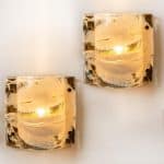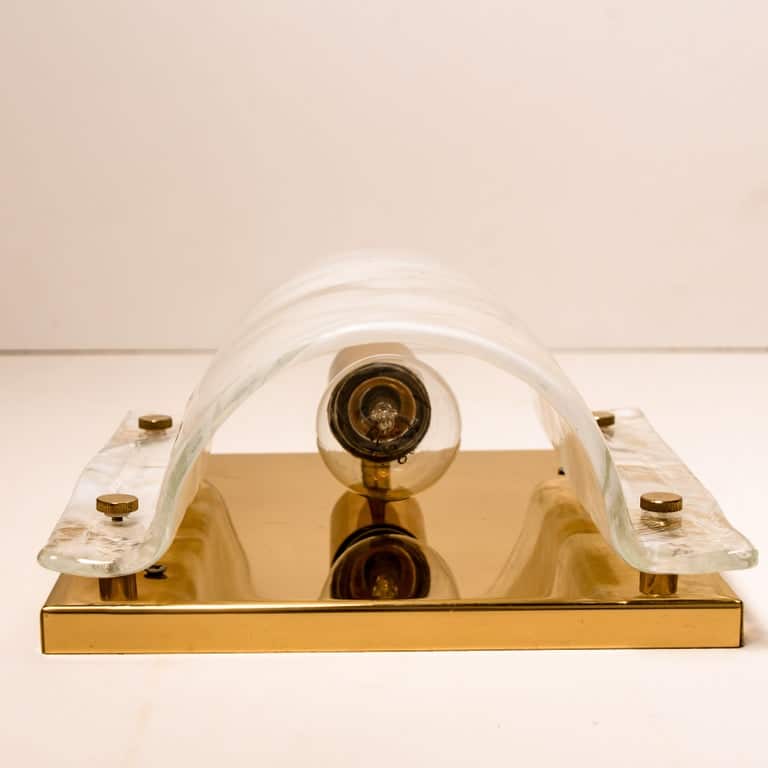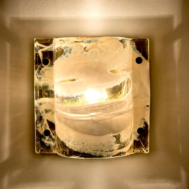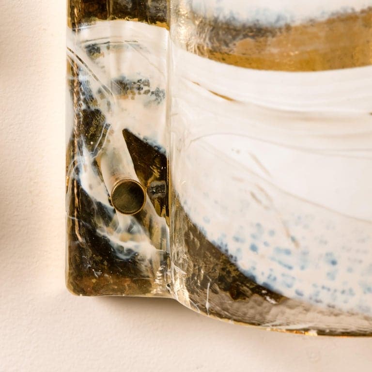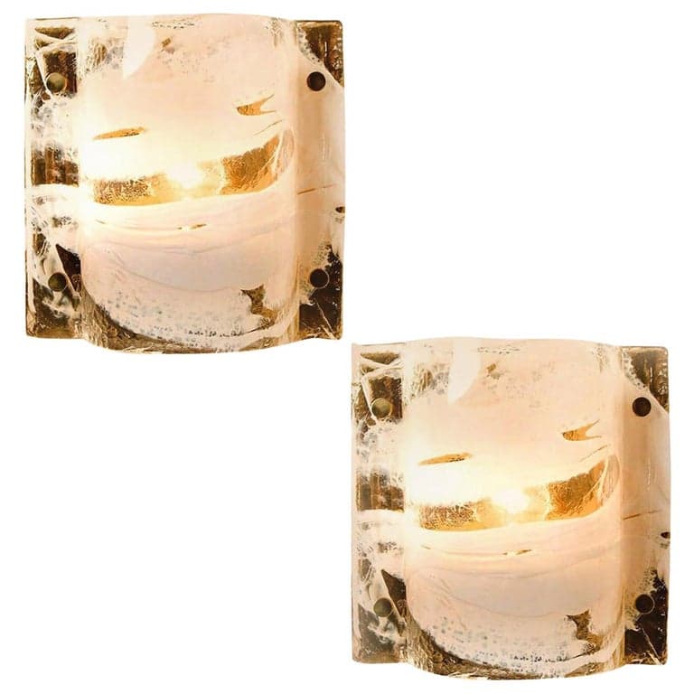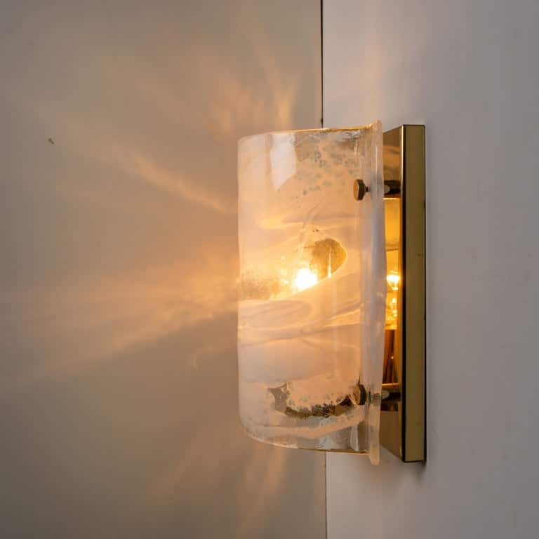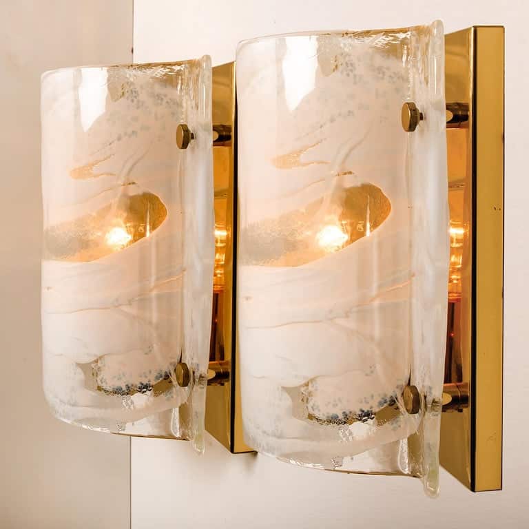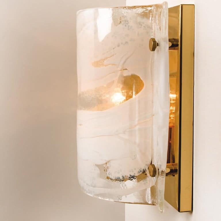 Pair of of elegant J.T. Kalmar sconces featuring thick white and clear swirl glass on a gilded brass base. Minimalistic design executed with a taste for excellence in craftsmanship. Illuminates beautifully.