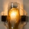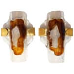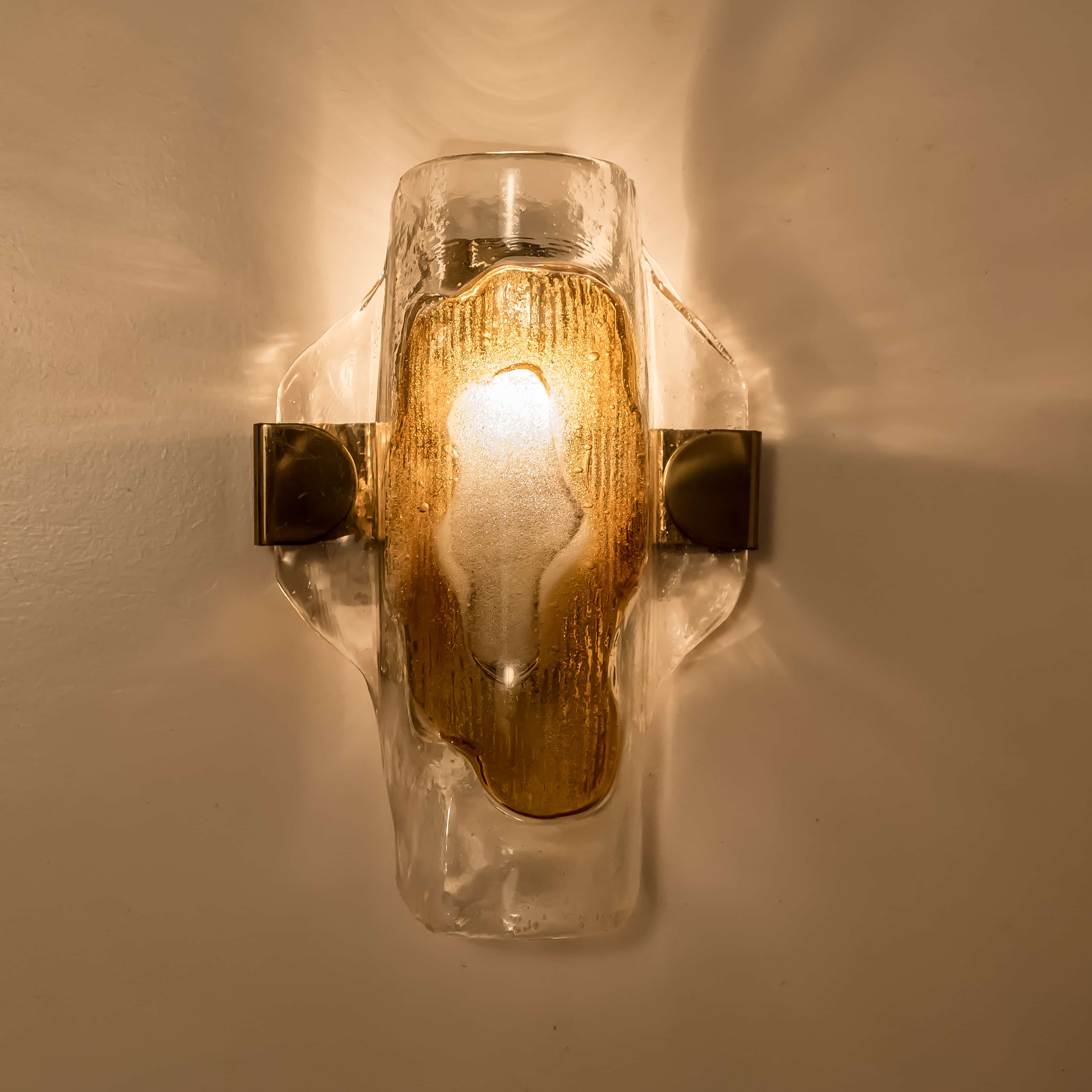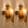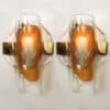 A brass frame and a bi-colored (clear and orange) hand blown Murano glass. Each piece of glass meticulously hand formed in clear glass with an orange amber-ish colored glass. The glass is shaped like a wave. Two small base bulb per sconce (2 x E14 max 40 W).