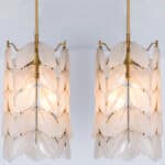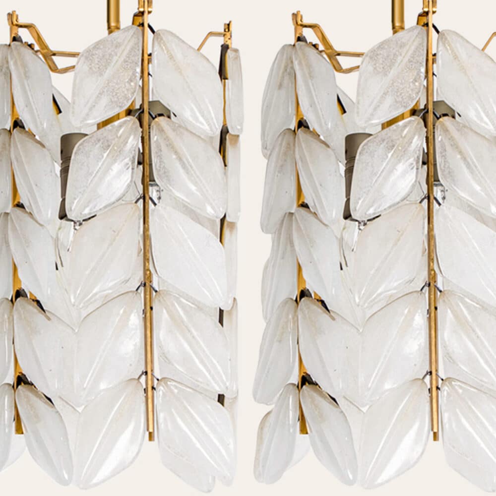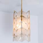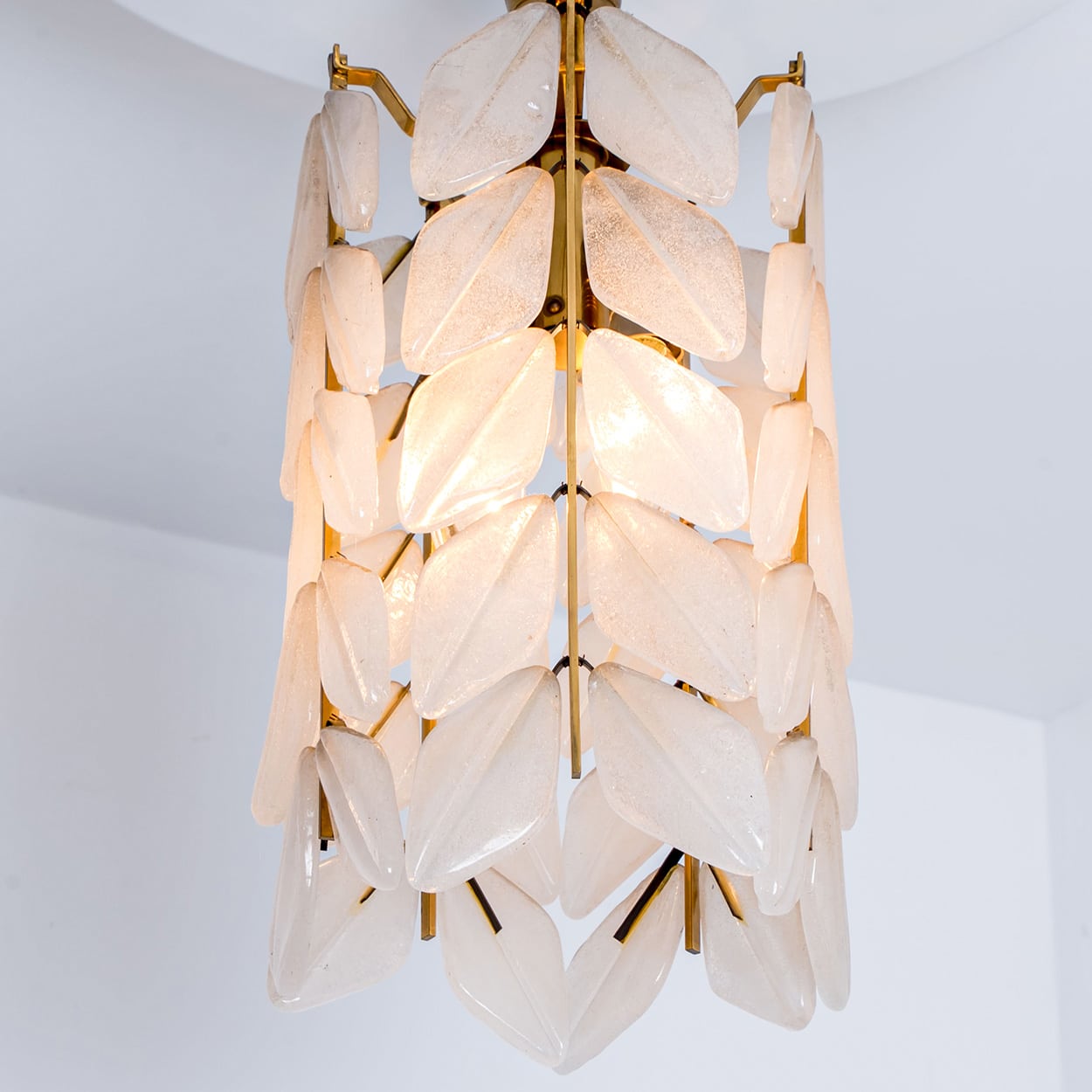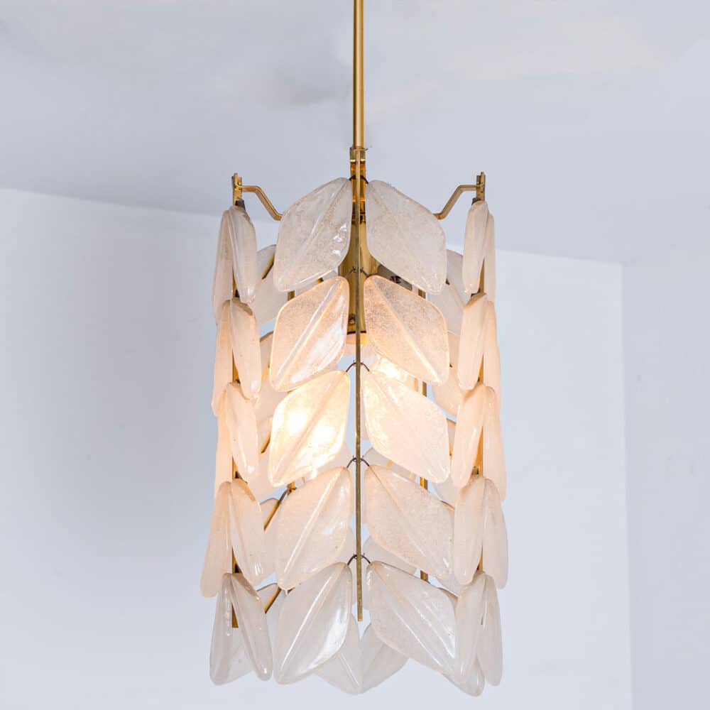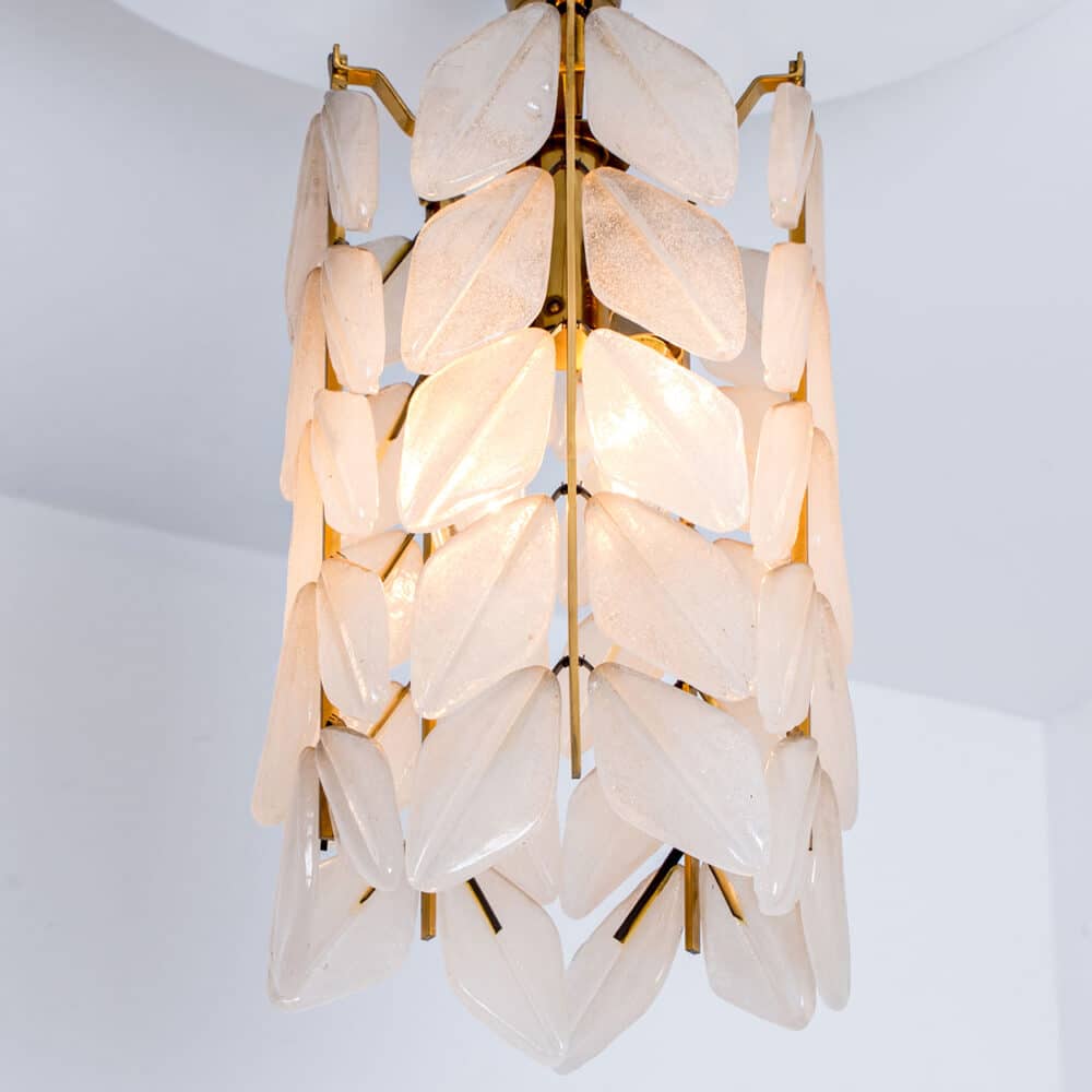 Cleaned and well-wired, in full working order and ready to use. The brass frame and glass leafs are in very good condition. The lights can be disassembled and the glass individually wrapped for easy transport. The fixture requires 3 E14 standard bulbs. Also LED compatible.
