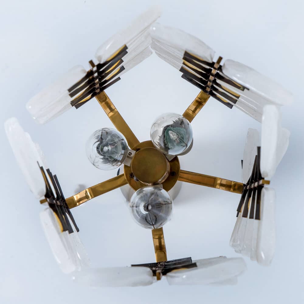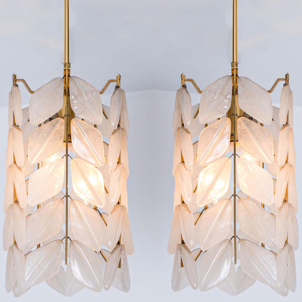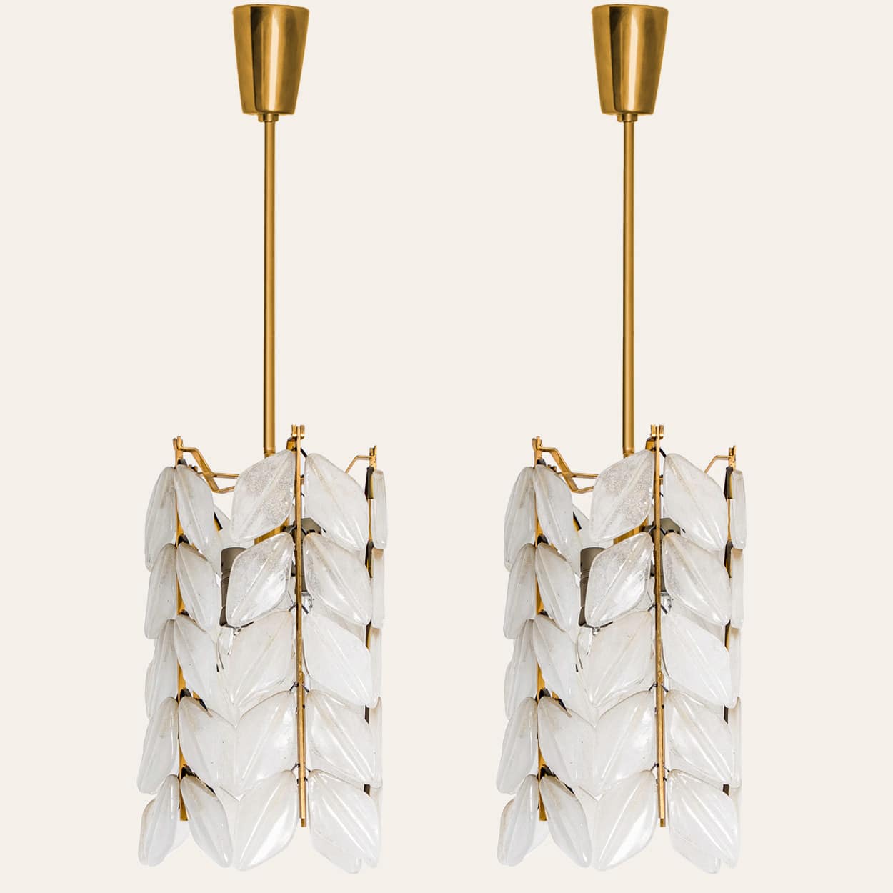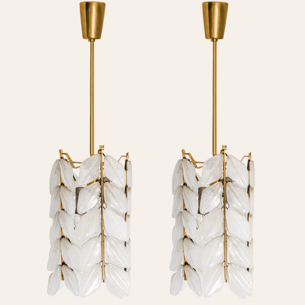Cleaned and well-wired, in full working order and ready to use. The brass frame and glass leafs are in very good condition. The lights can be disassembled and the glass individually wrapped for easy transport. The fixture requires 3 E14 standard bulbs. Also LED compatible.