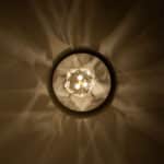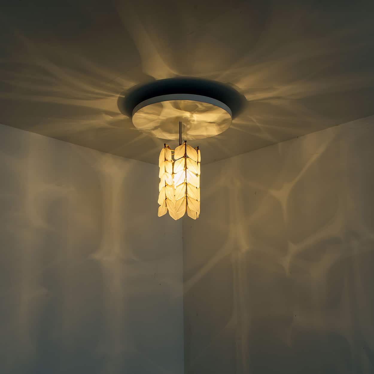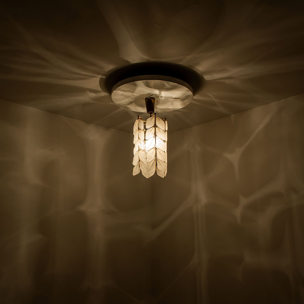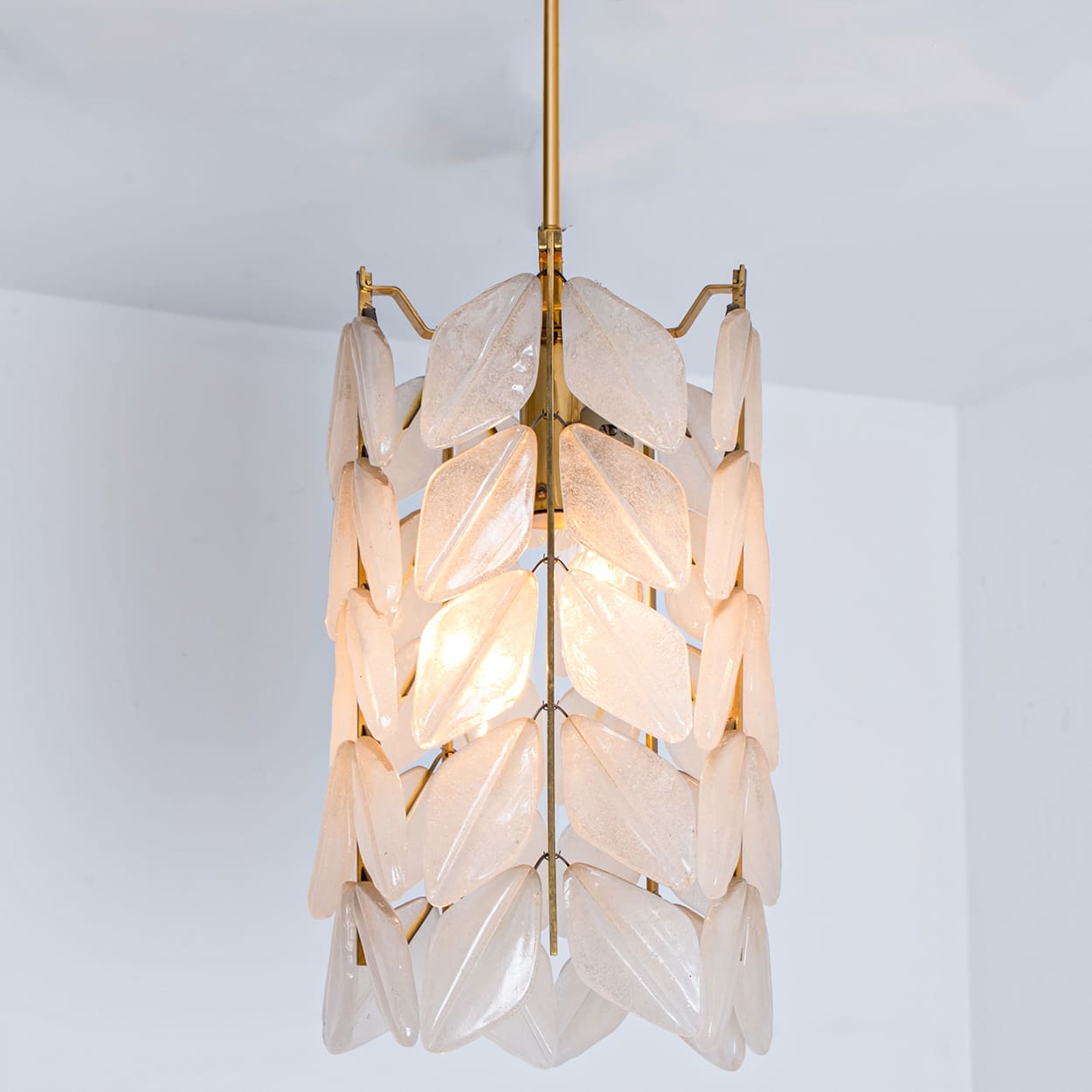 The frosted glass parts create beautiful leafs, mounted on a brass frame. Illuminates beautifully.