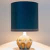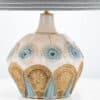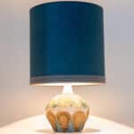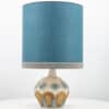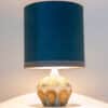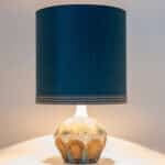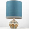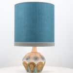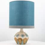 A beige ceramic table lamp with blue and brown accents. Sculptural piece, made of handmade ceramic in fresh tones, with a new custom made matching silk lampshade by René Houben.
