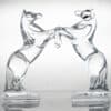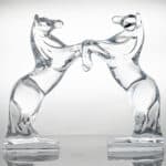 The sculptures are two horses. The horses, made from clear crystal, are rearing up on their hind legs .