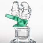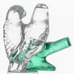 Luxury at its finest, high-end glass carafe with lovebirds on green glass stick by Sèvres, France.