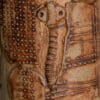 This beautiful shaped base with beige and terra tones fits perfectly with the beige custom made silk shade and brown piping with bronze inner shade. The shade has a beautiful shape with an opening on one side. Illuminates beautifully.