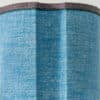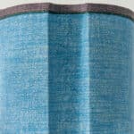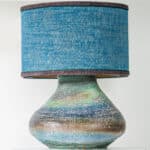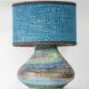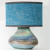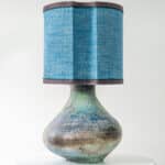 This base with a unique shape and multicolor ceramics fits perfectly with the custom made lamp shade with a blue color and brown trimming. The shape of the shade is very unique. A bold piece.