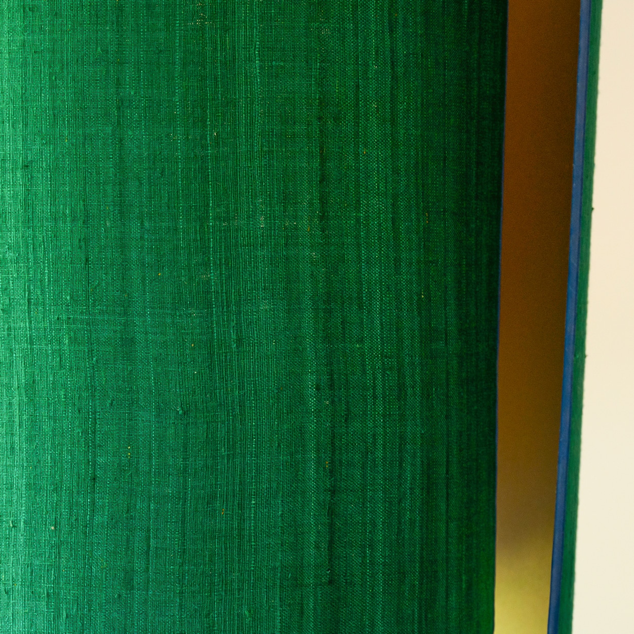 This base with Sapphire blue shades fits perfectly with the custom made jade green lamp shade with blue piping, and bronze inner shade.