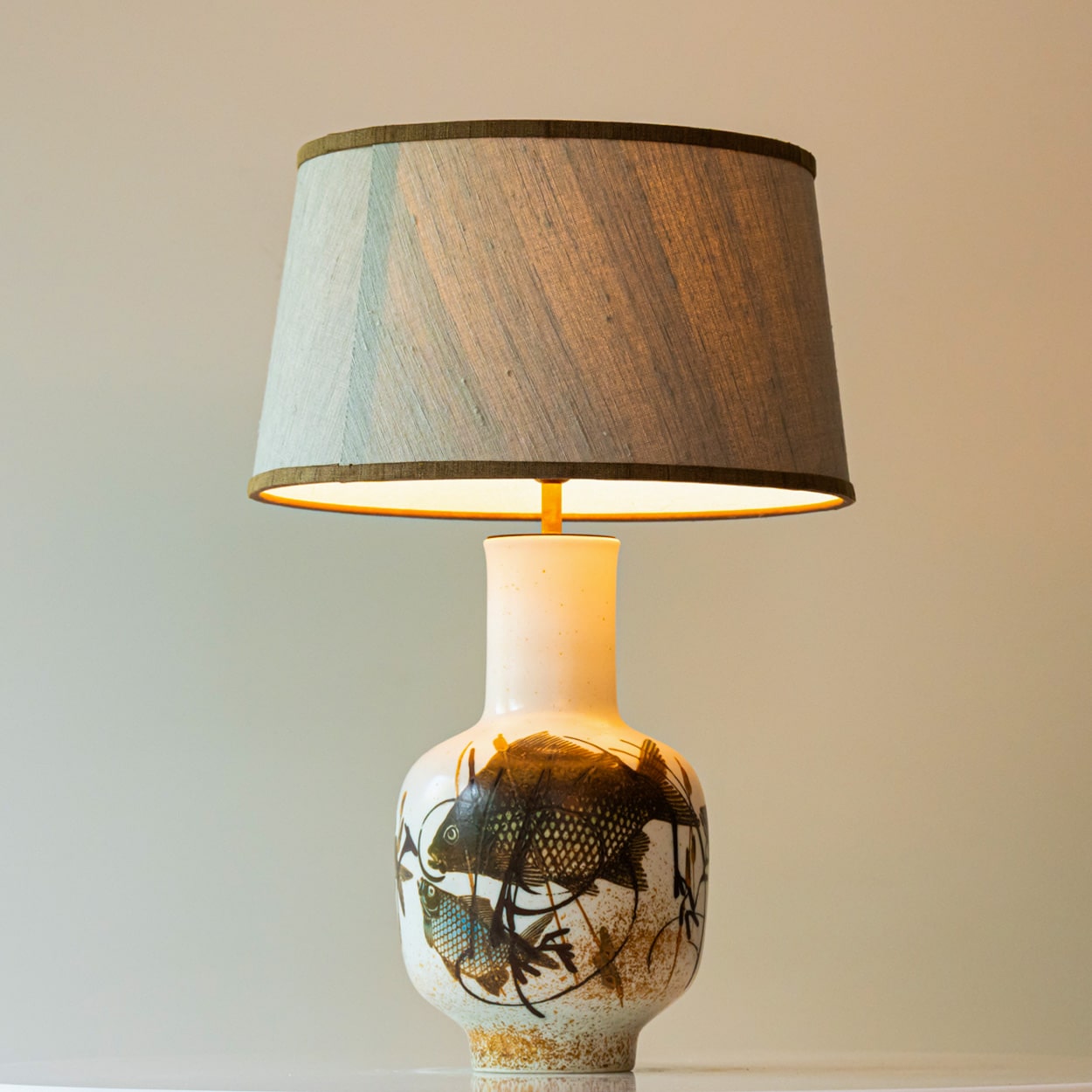This beige base with a fish motif on it fits perfectly with the custom made beige colored shade, with beige inner shade and brown trimming.