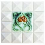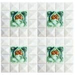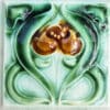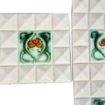 Handmade tiles in cream white with green and brown glazed color. With an Art Deco illustration. Manufactured around 1930 by Societe Morialme.