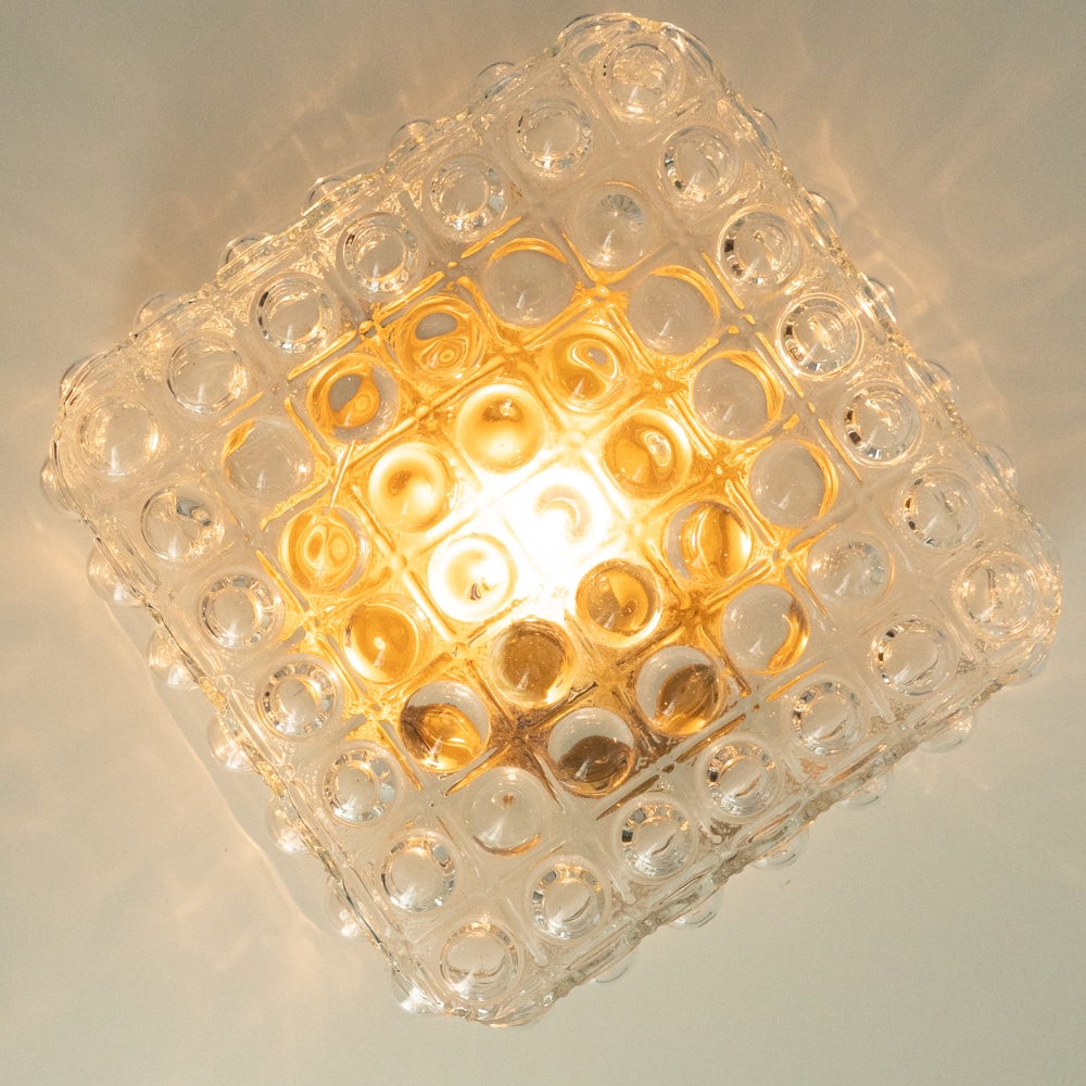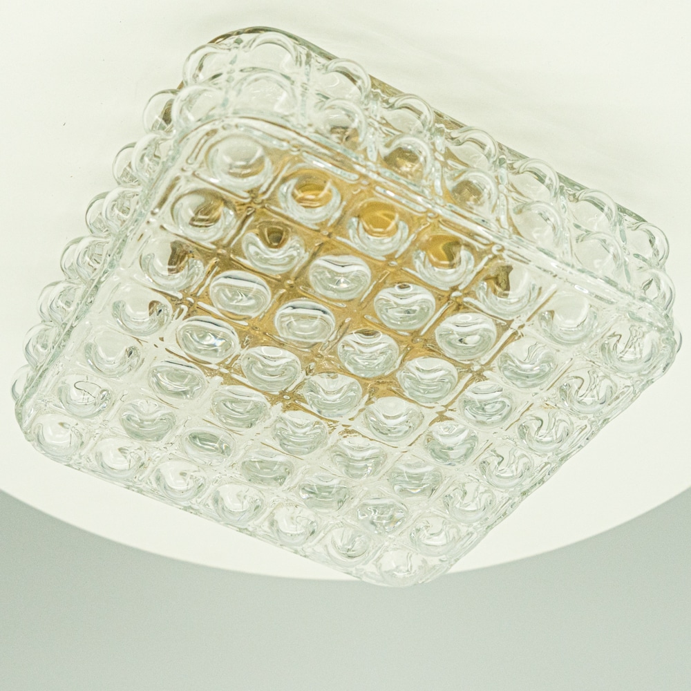 Square Bubble Glass Flush Mounts in the style of Helena Tynell, manufactured in Germany in 1960. The bubble glass gives a wonderful glow. The square glass is mounted on a brass colored metal back plate.