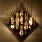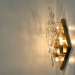 High-end gilded brass wall light by Stilkronen, made in Italy, circa 1975. Each fixture is featuring a weave-like array of branches holding clear crystal droplet-pieces. The crystals refract light beautifully and are perfect for a soft, warm and welcoming glow in the room.
