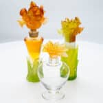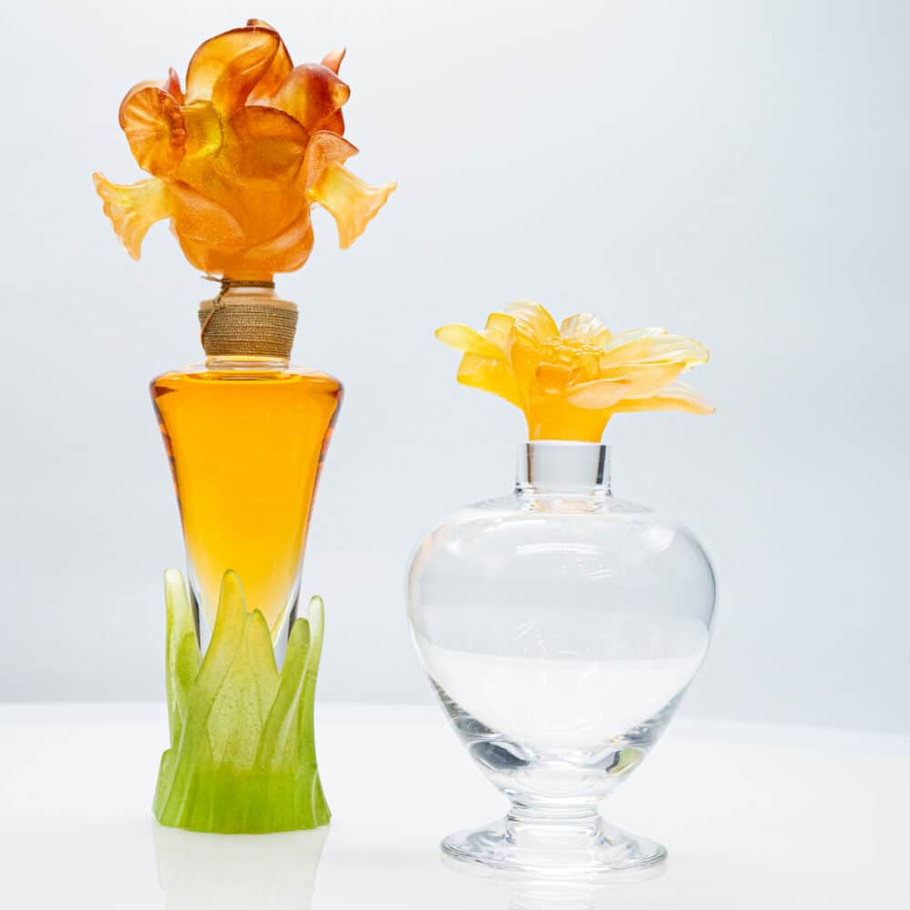 Luxury at its finest, made by the World renowned French maker of ‘Daum’ of Nancy, France circa 1960-80. The set of crystal masterpieces of exceptional proportions crystallises the Daum craftsmen’s extraordinary know-how. Hand-crafted with frosted yellow, orange, green and clear glass, with a beautiful flower arrangement.