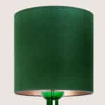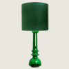 The glass table lamp features a bright green transparent base with a chrome rod running through the center. Finished with a custom made green shade by R. Houben. The innershade is bronze colored and illuminates beautifully.