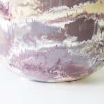 This decorative base by Paul Schneider with burgundy, purple, cream and white tones fits perfectly with the custom made silk shade with trimming in matching color.