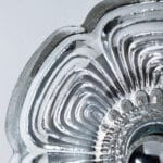 This modernist elegant design is focused on the textured flower shaped thick glass glass, with off white metal base. These wall lights would complement a range of decor schemes.