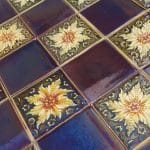 Recently lifted from its original home, a unique and antique set of Art Deco handmade tiles by S.A. Des Pavillions, Florennes. A beautiful relief and color. With stylized design. These tiles would be charming displayed on easels, framed or incorporated into a custom tile design.
