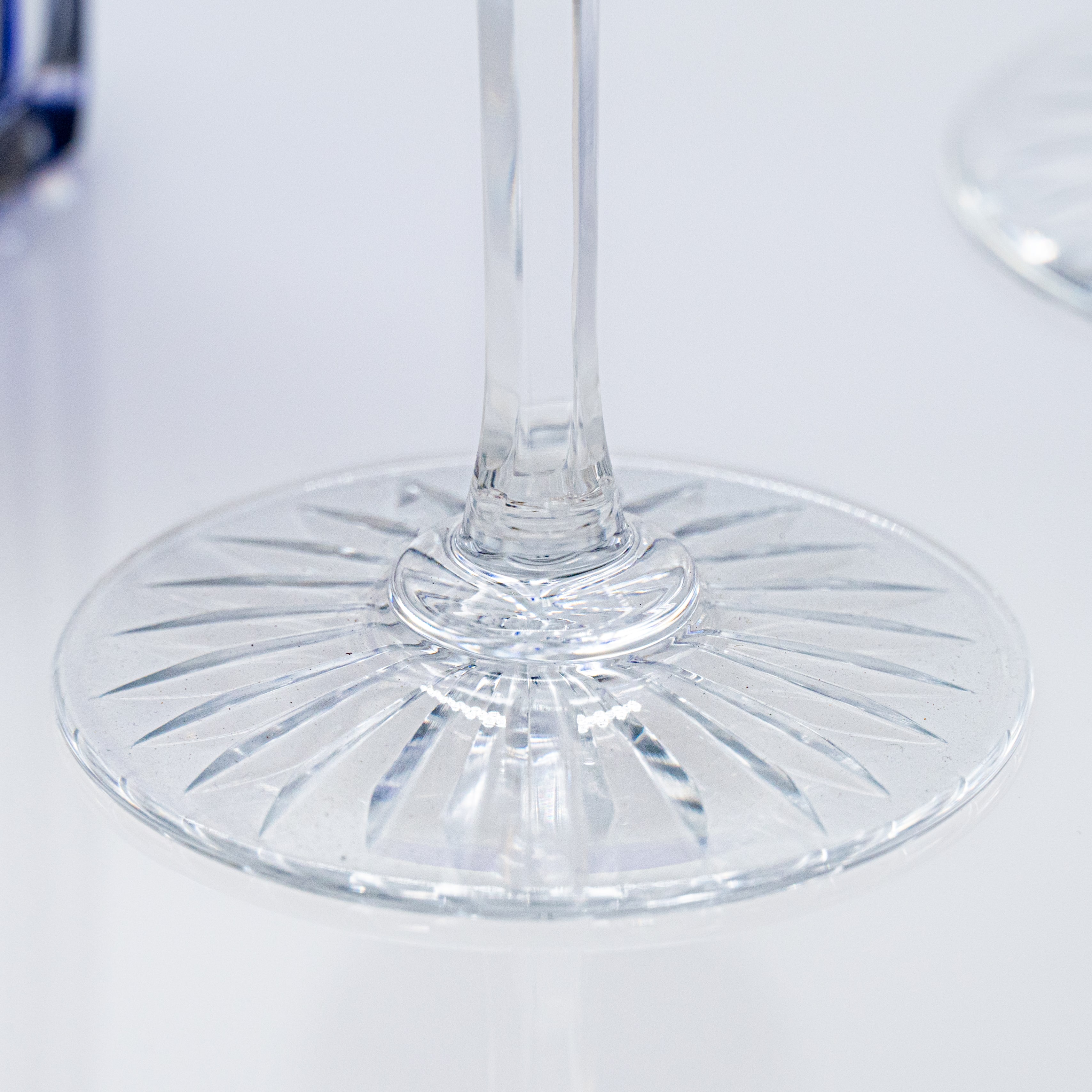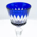 Luxury at its finest, set of 6 high-end glasses and 1 carafe in deep blue double- layered crystal by Baccarat with an beautiful carved decor.