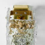 Cleaned and well-wired, in full working order and ready to use. The brass frame is in very good condition. The wall lights can be disassembled and the glass individually wrapped for easy transport. The fixture requires 1 E14 standard bulb. Also LED compatible.