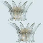 Beautiful wall lights were designed in the style of Kalmar, featuring a brass base and a rectangular glass cover in opal and clear glass. The glass cover consists of one layer of beautiful palm leaves put together to create a “palmette” look, which makes for a gorgeous light effect.
