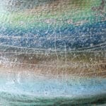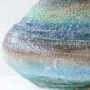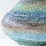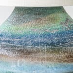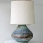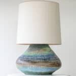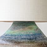 This base with a unique shape and multicolor ceramics fits perfectly with the custom made lamp shade with off white tones and a brown triming. A bold piece.